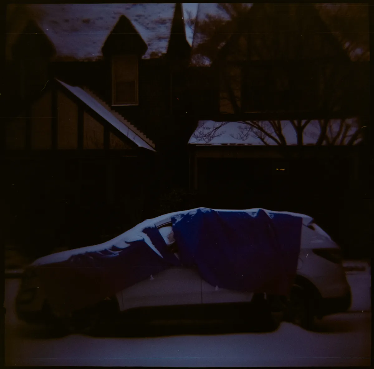 like most of us in the east coast of the us, we got hit with a pretty big winter storm today. i spent much of last night reading too much into forecasts and was getting a little anxious, though i think some of that has to do with some lasting ptsd from hurricane helene, while i was in asheville. it started snowing late last night, around 11:00 or midnight. i woke up to quite a winter wonderland, and immediately put on boots and my trusty peacoat (my ride or die navy issue that i've had since i was 16 years old), and trudged through the sleety snow covered streets with my plastic diana camera in tow (also a camera that i've had since i was 16, a 2007 urban outfitters exclusive, haha), loaded with some color film. i walked by my car, cleared it off, and then continued to walk around the block, clicking photos at random. there was no way i'd be able to drive anywhere today, so it was up to my feet to take me about my day. richmond doesn't do a very speedy job of clearing the roads when it snows like this, and even now they are still covered in a thick icy blanket. it was honestly kind of cool, through out the day and even into the night, people were just hanging out in the middle of the streets, chatting and walking around. the energy was very warm, despite the actual temperature. i walked by a dad who was trailing a sled tied to his car down a side street, his kids laughing behind and trying to stay on the plastic sled. i eventually made my way to my friend's house, and spent the afternoon developing some film. i developed two rolls of color film.