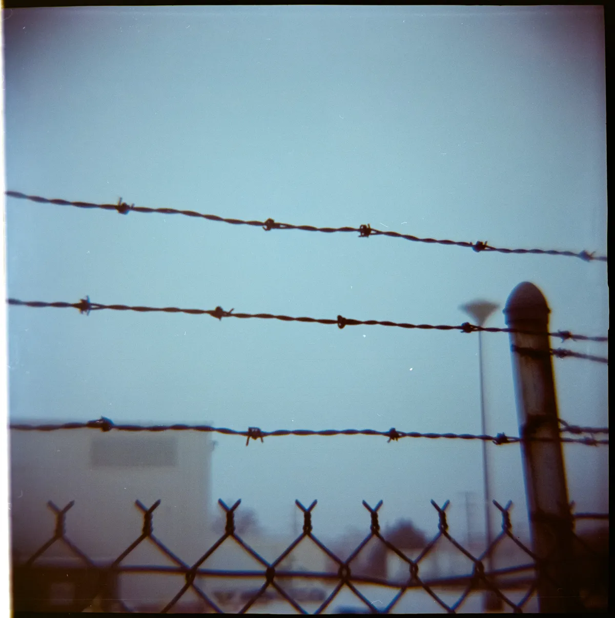 getting closer to my friend's house, i was walking along a barbed wire fence next to a shipping yard. naturally, i had to direct the camera towards the top of the fence, hoping it would be in focus that close. the barbs ran diagonally along the bottom of the frame, and the background gently phased out of focus with that effect only cheap plastic lenses can provide.